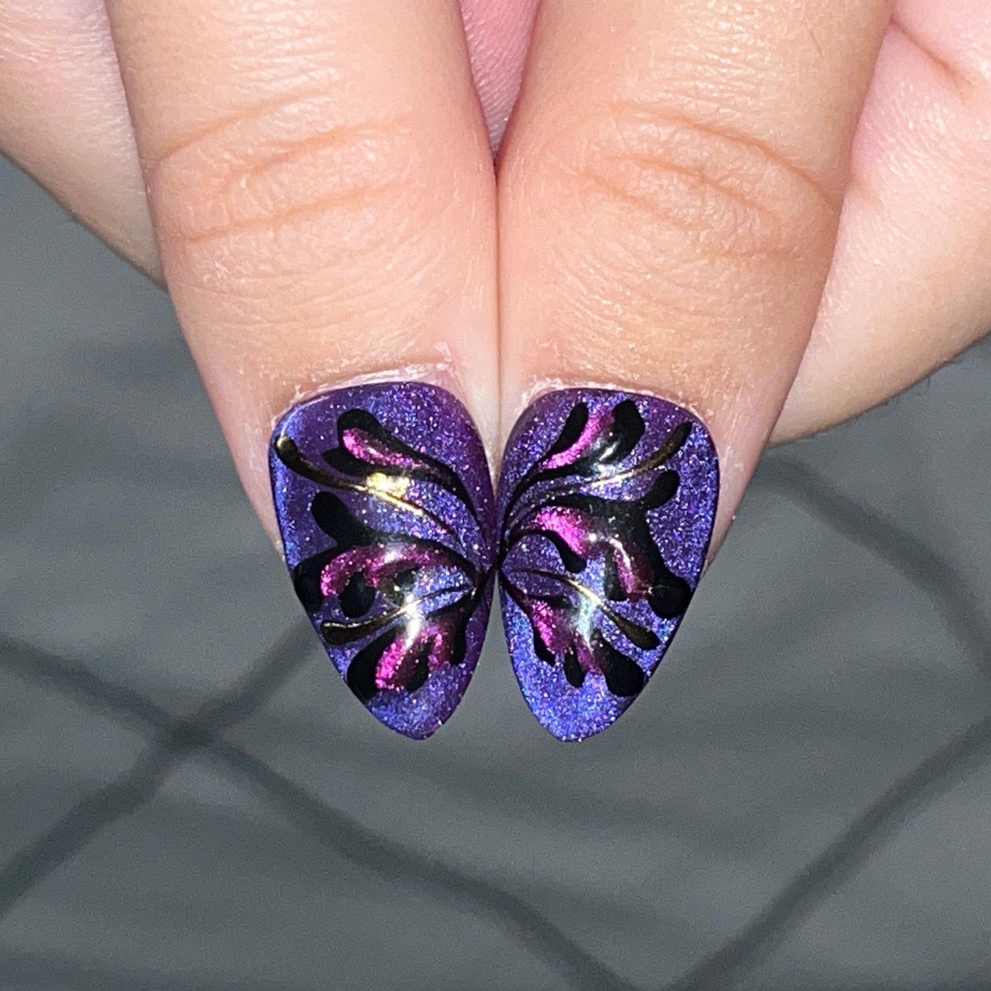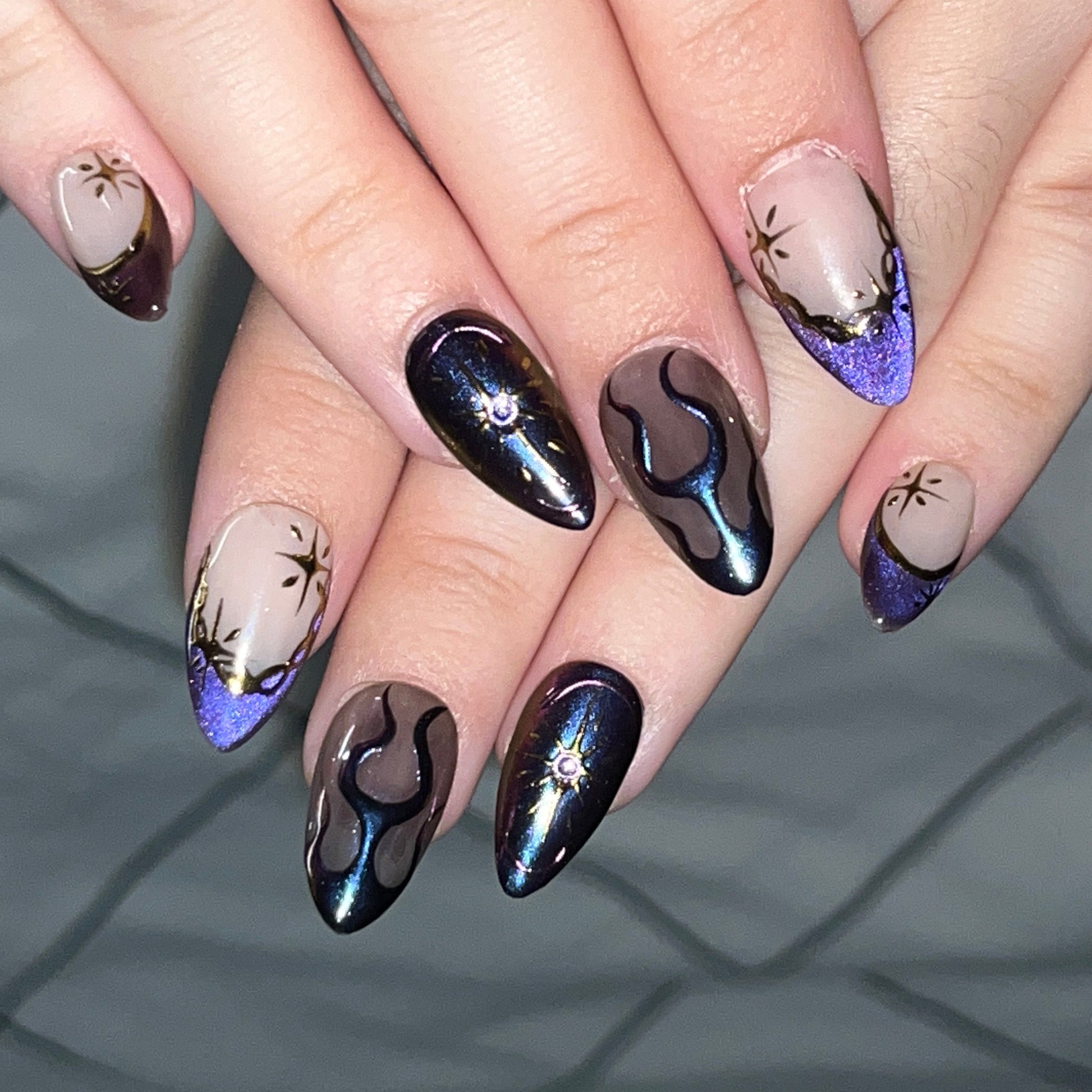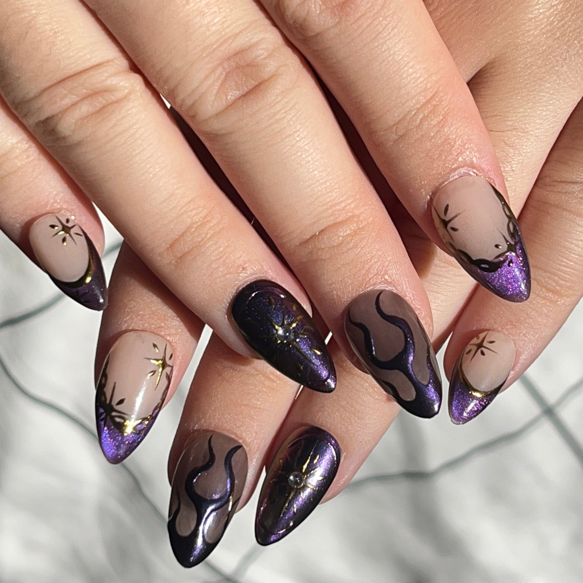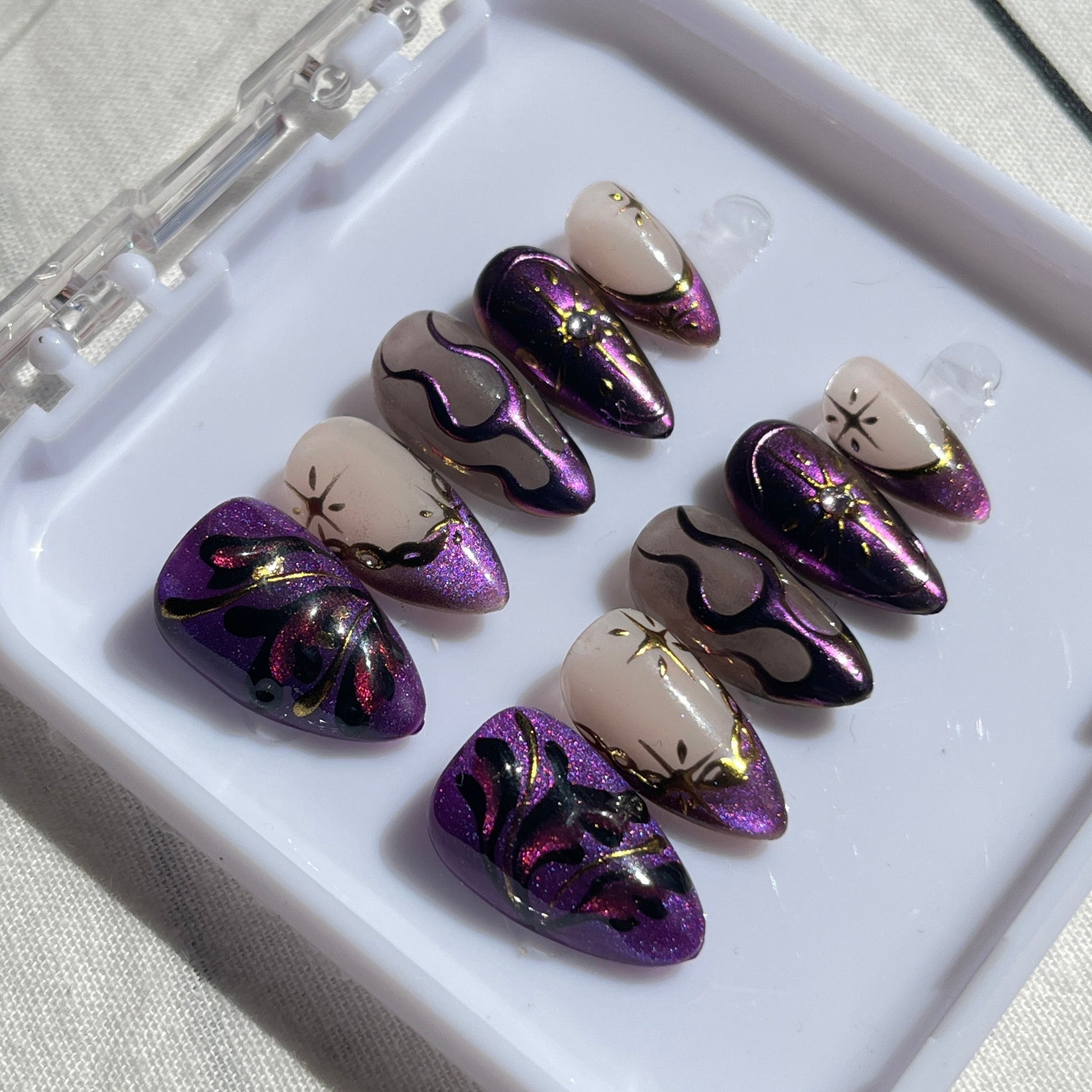 Bound by darkness, yet beautifully untamed ⛓️ These press-on nails glow in deep chrome purple, adorned with hand-painted golden chains and shadowy mystical details—capturing the allure of forbidden magic