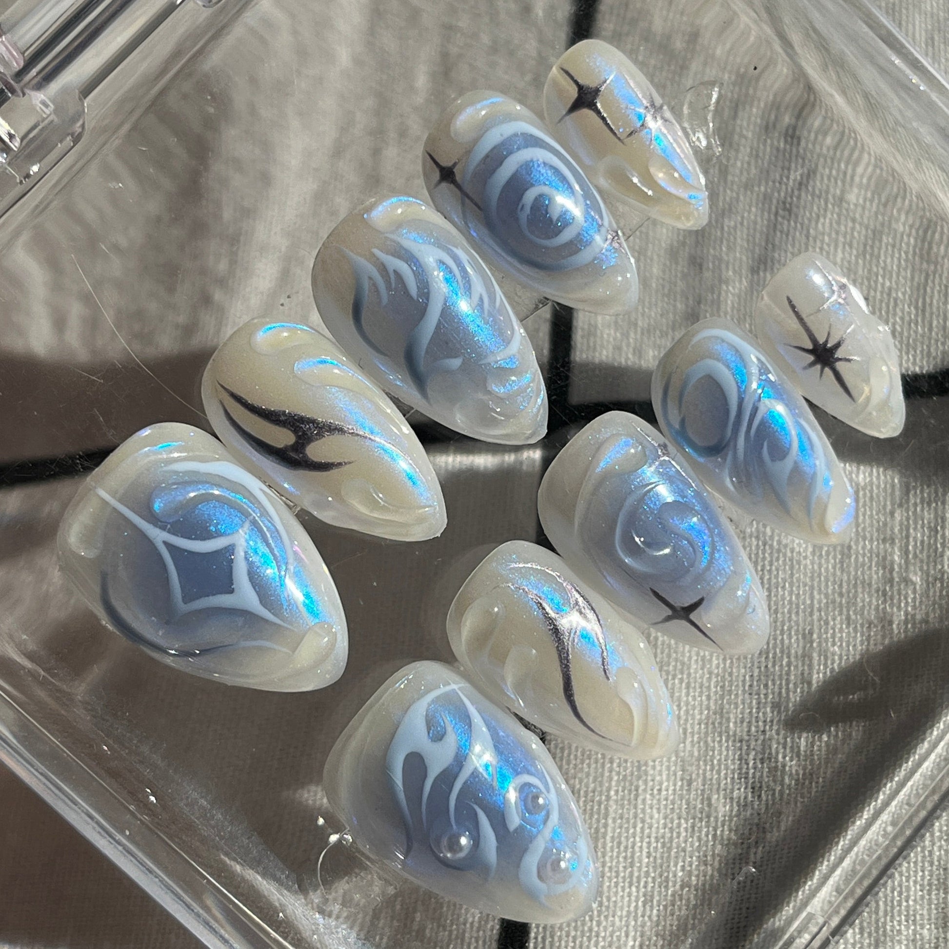 Description: Iridescent white press-on nails with a soft blue shimmer that dances like the wind. Adorned with doves and swirling gusts, equip them to summon a gentle breeze that follows your every step 🍃