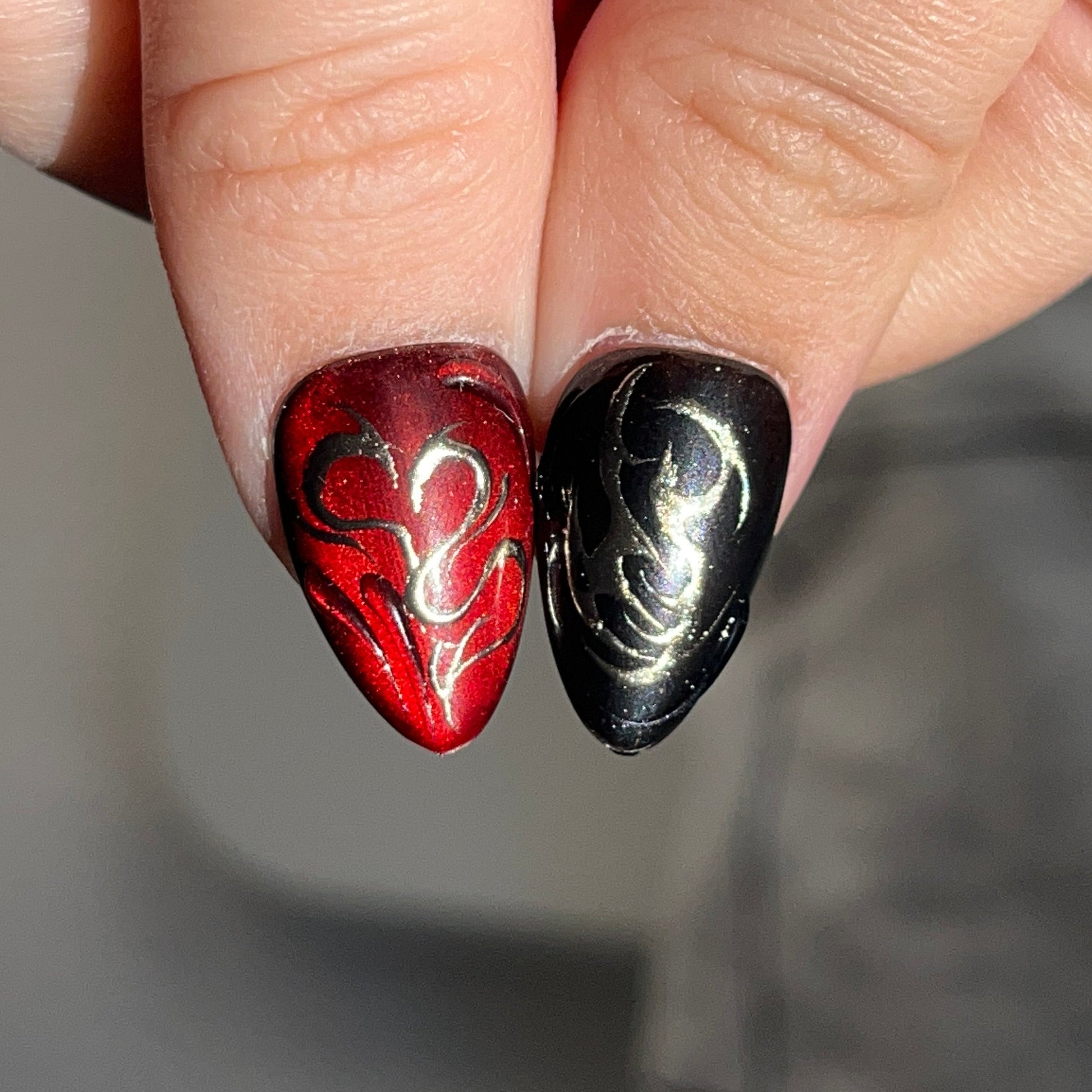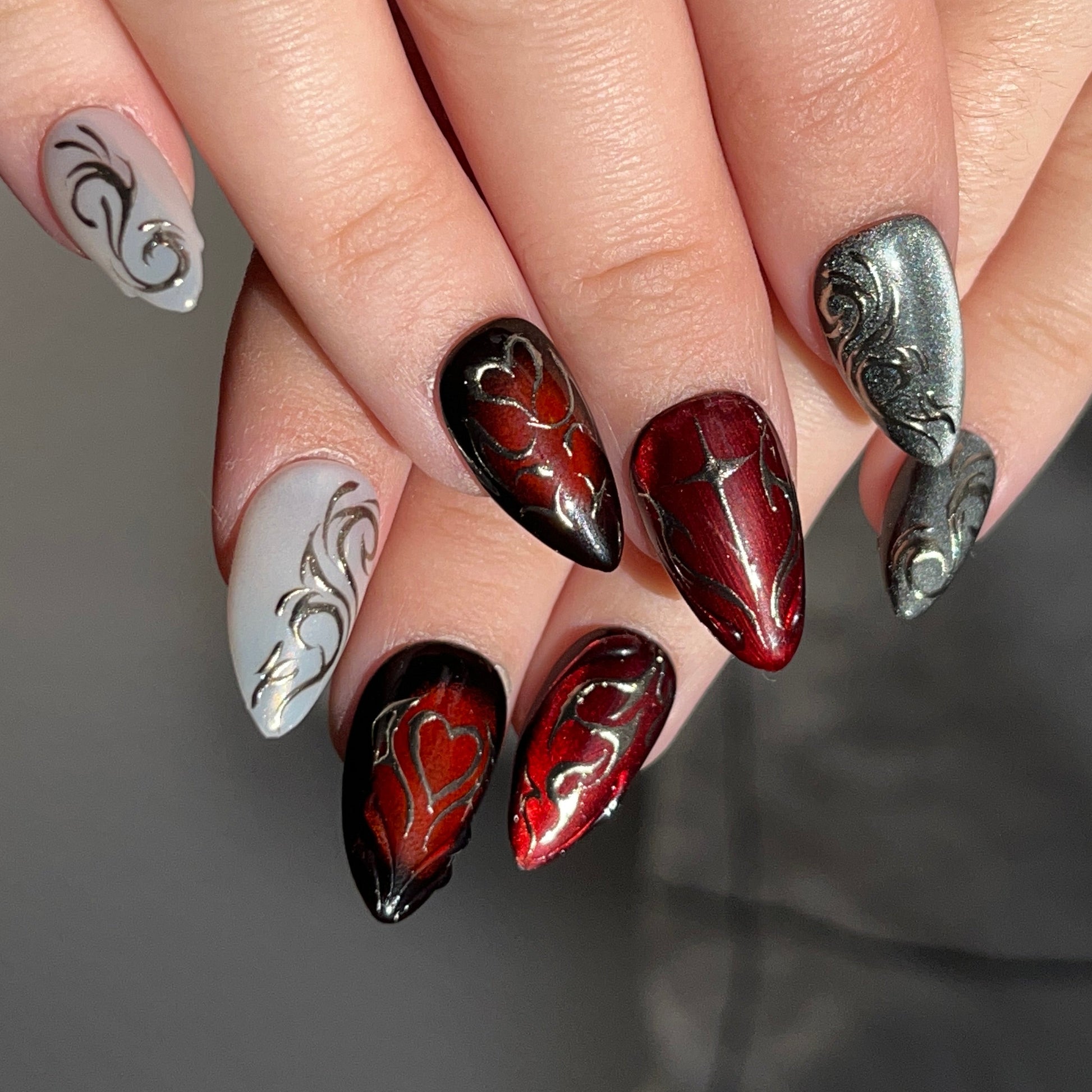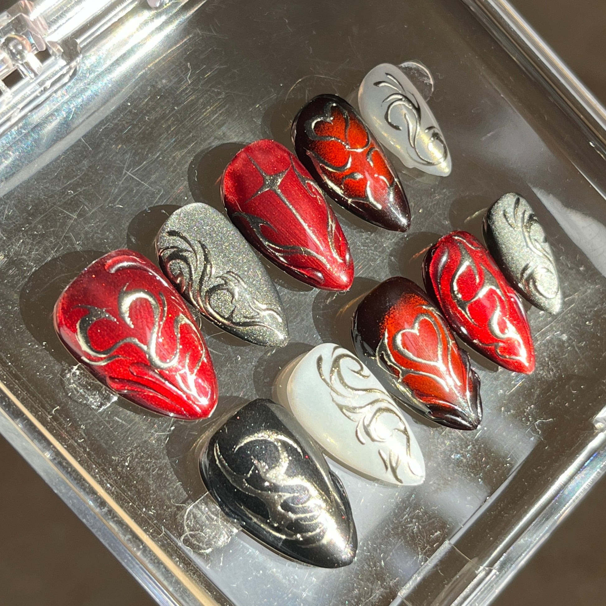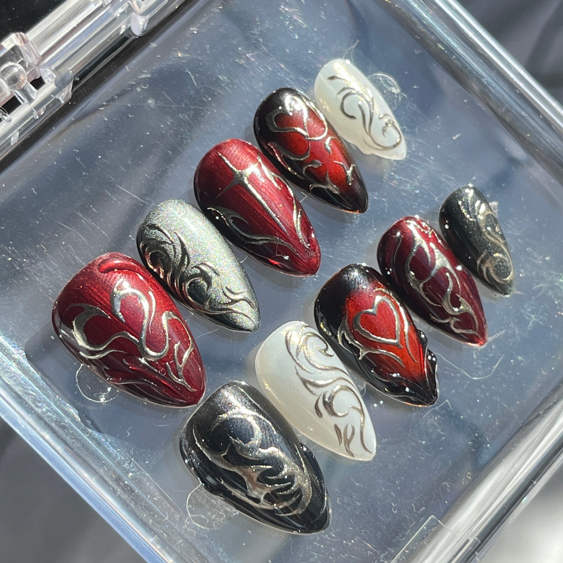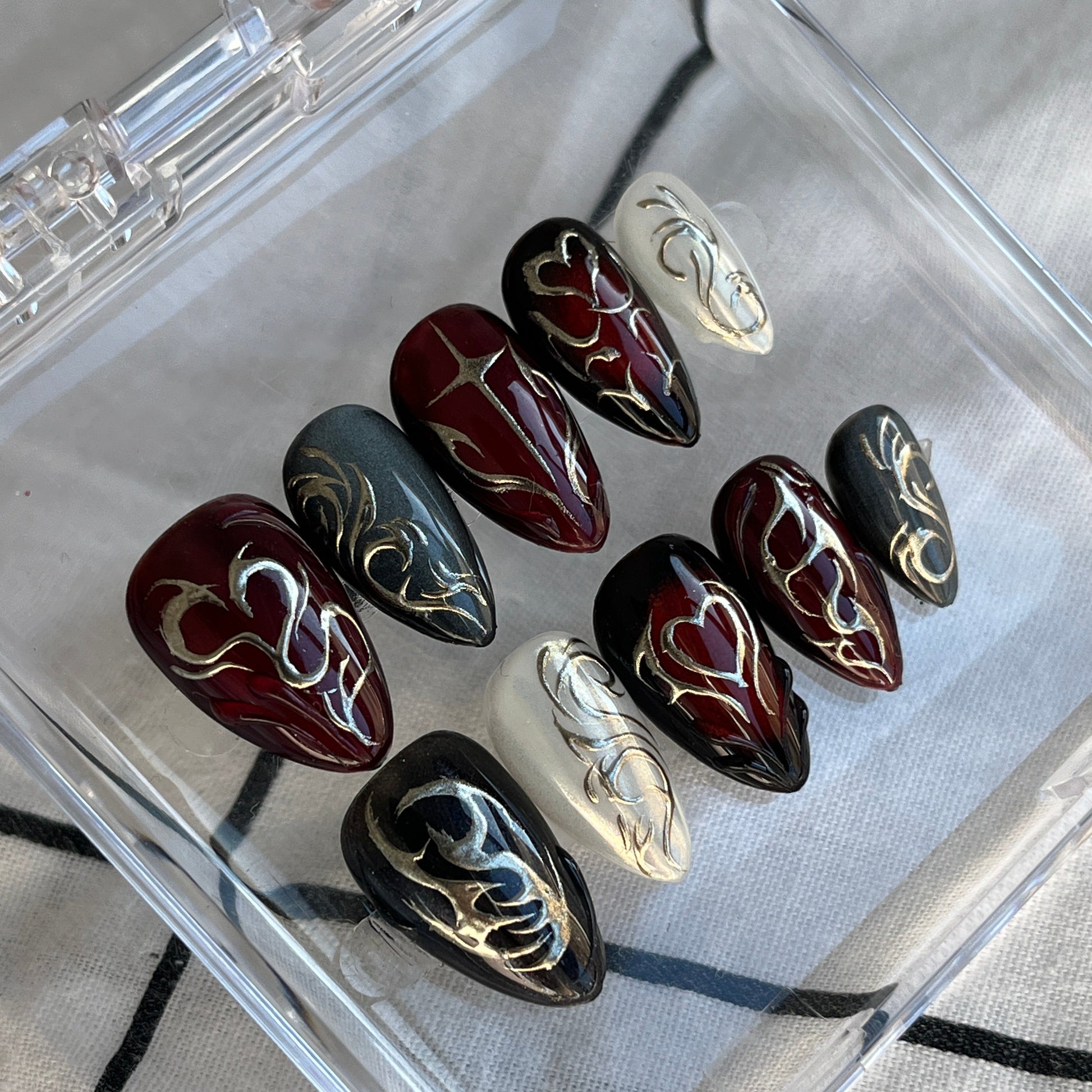 Description: Deep crimson and black press-on nails highlighted with white and gold accents. Adorned with smoky heart curls, sea-monster motifs, and elegant pistol silhouettes, they carry the allure and danger of a legendary outlaw. Equip them to gain a +15% Critical Charm Chance in every encounter