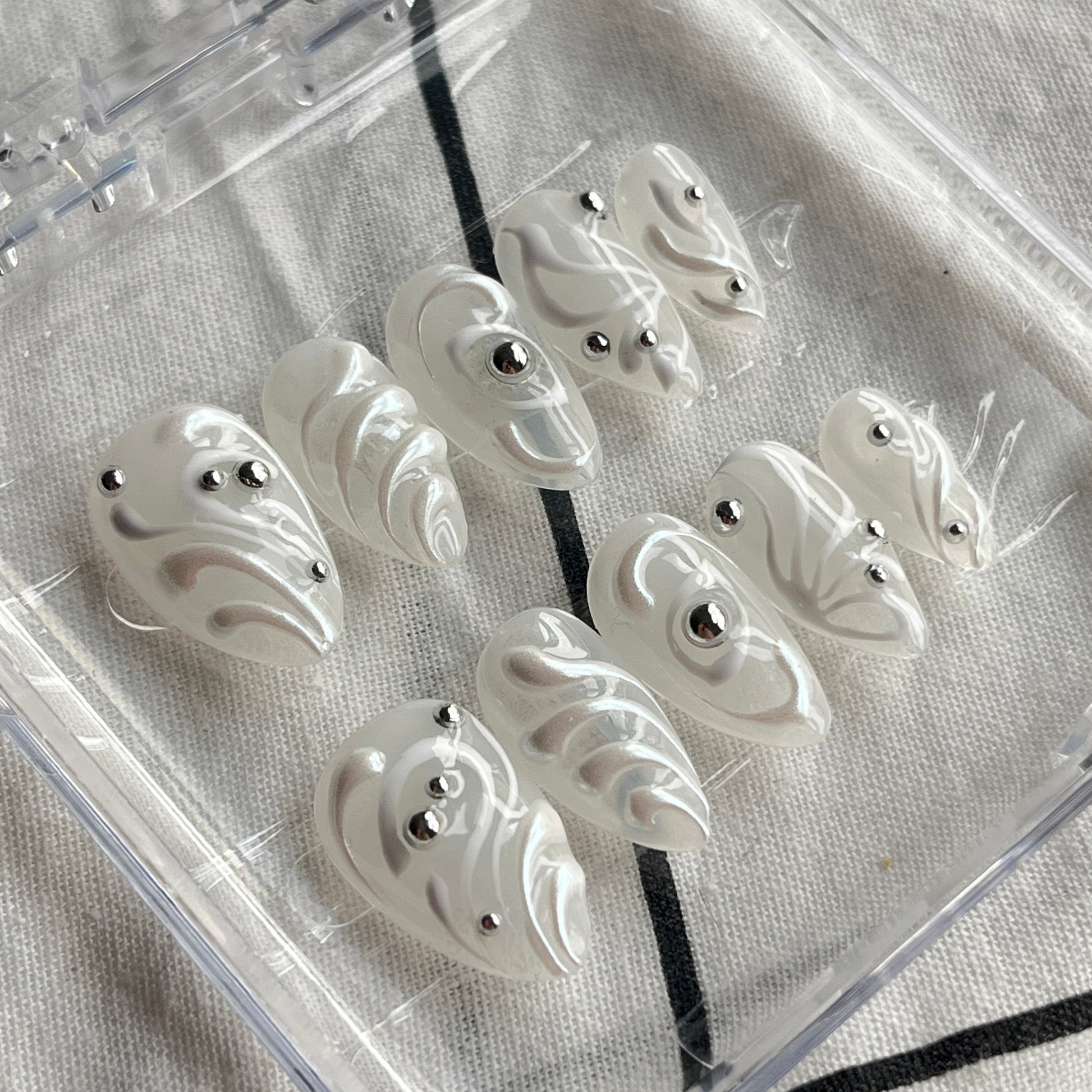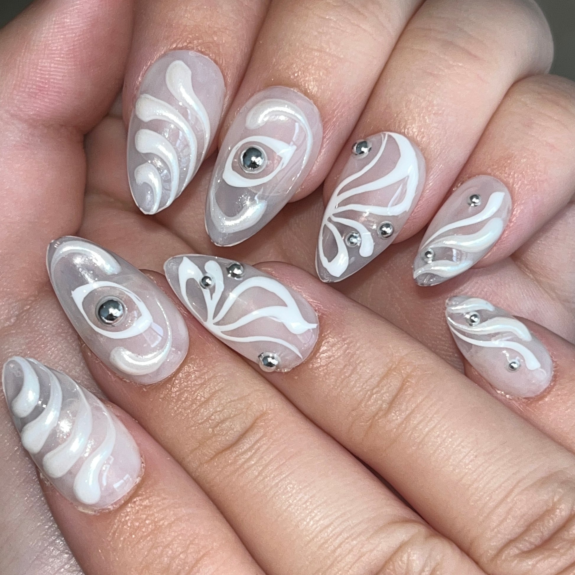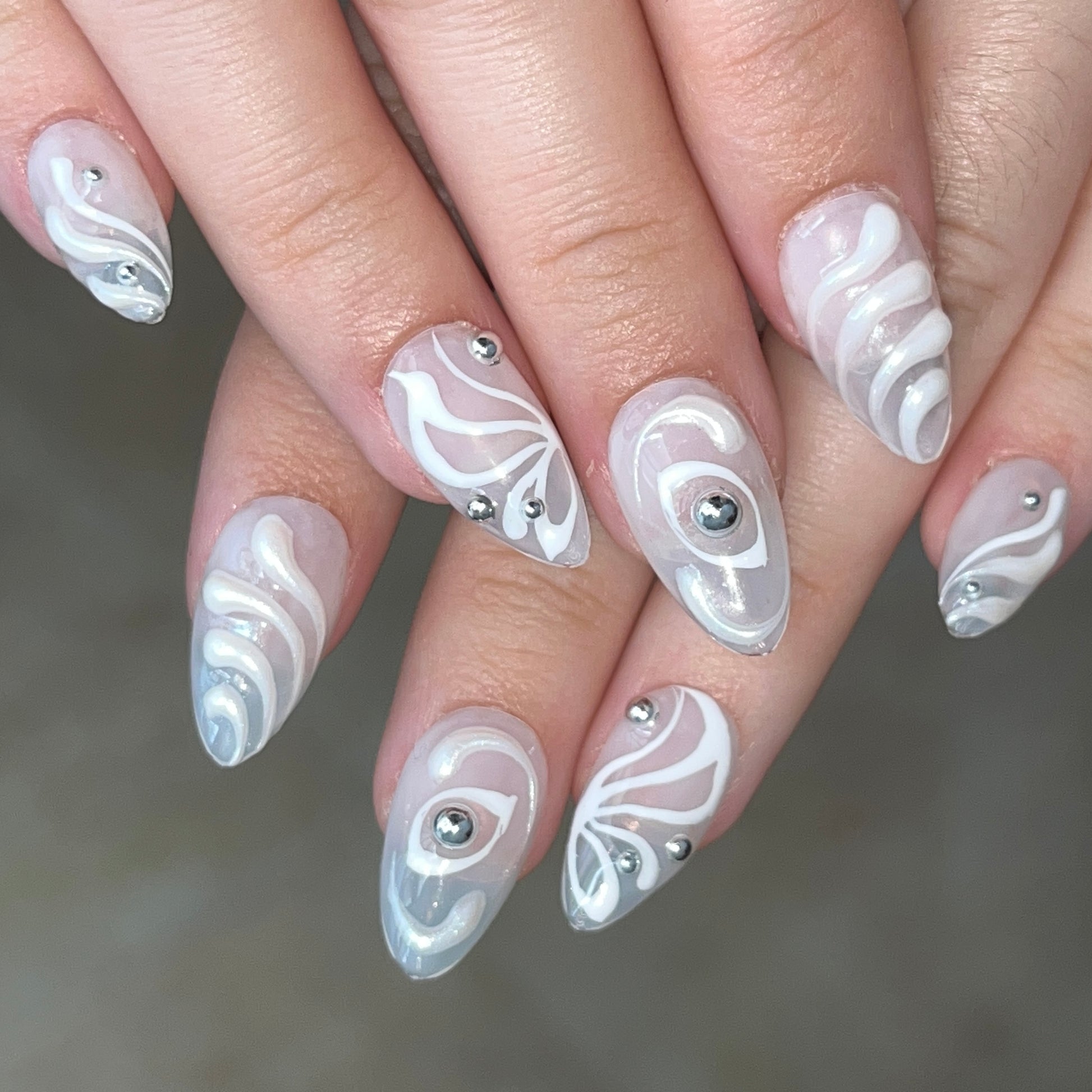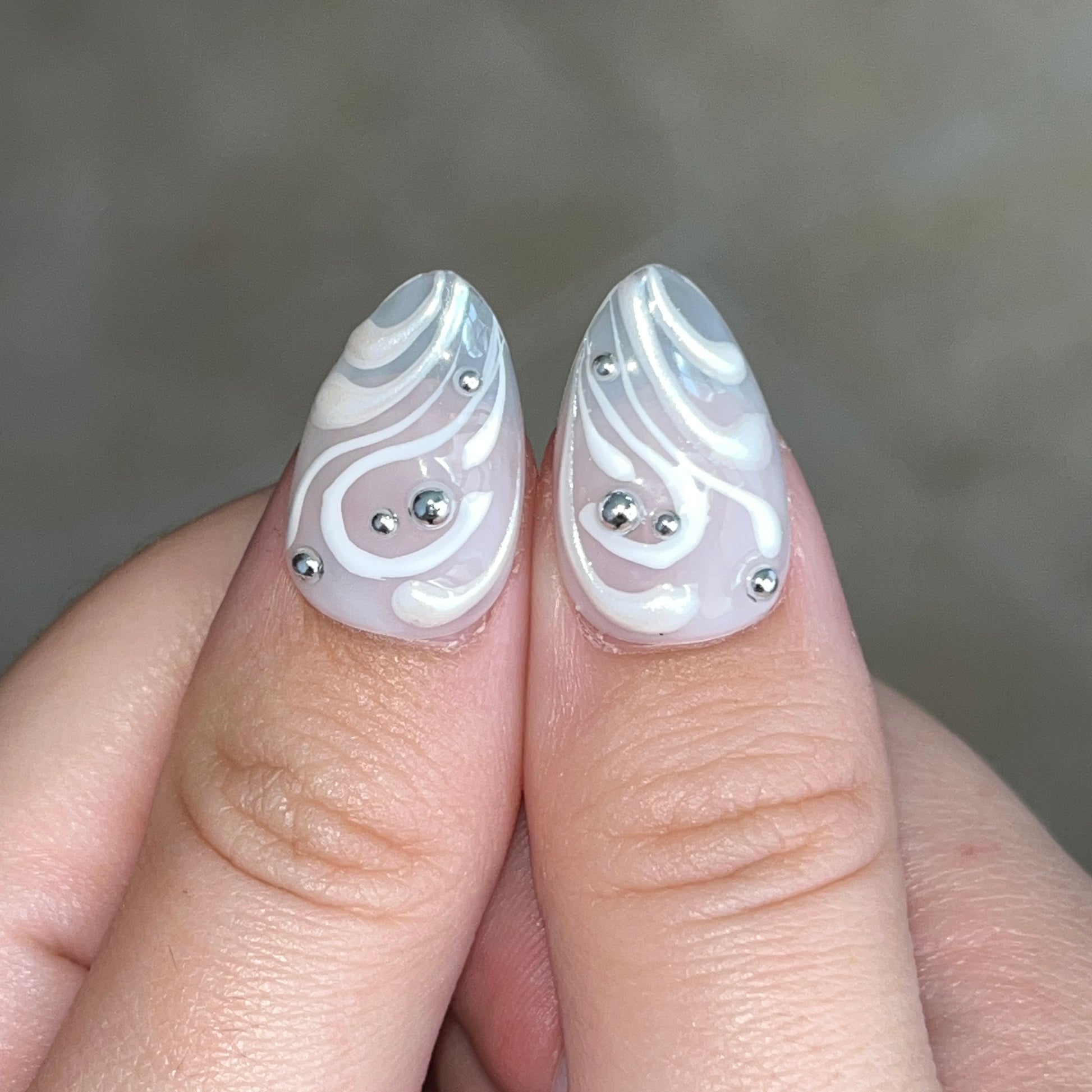 Inspired by Mira’s nails from Huntrix in How It’s Done! White jelly base with pearly accents and silver touches 🌠