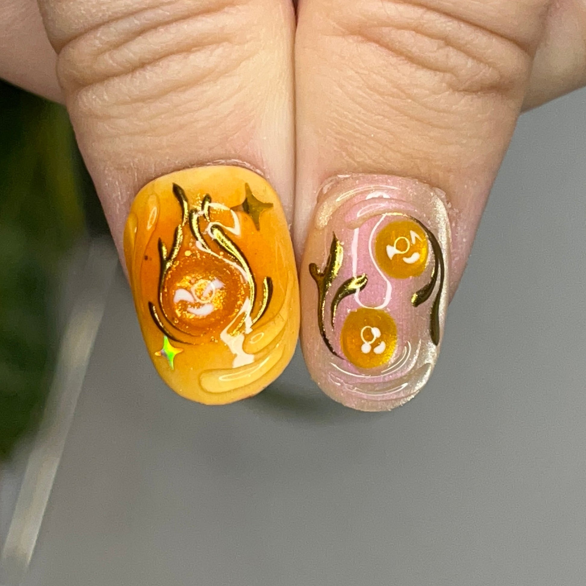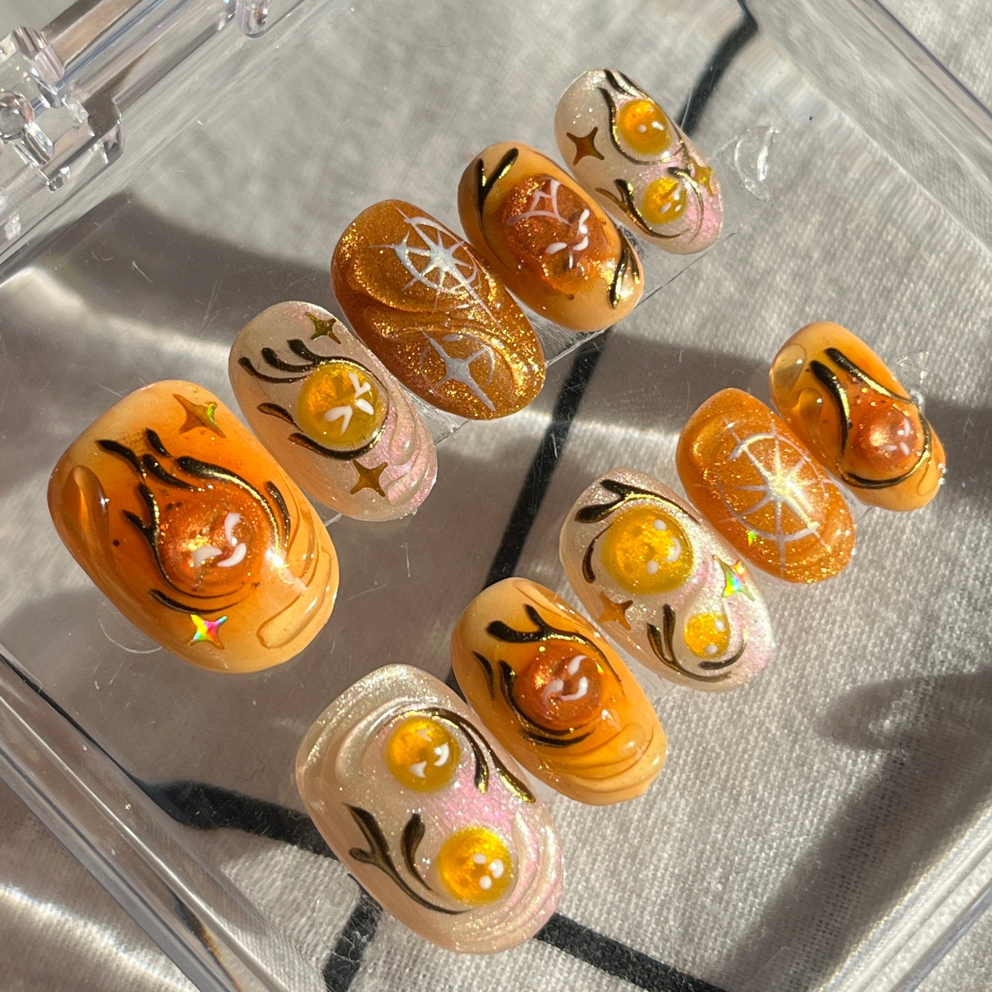 Description: Bright orange press-on nails infused with tiny fire spirits. Their shimmering glow channels Milio’s gentle magic, equip them to summon a loyal flame companion on your journey 🧡