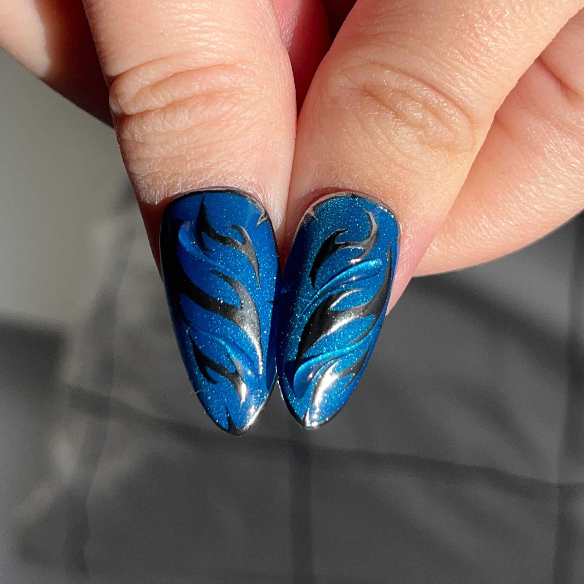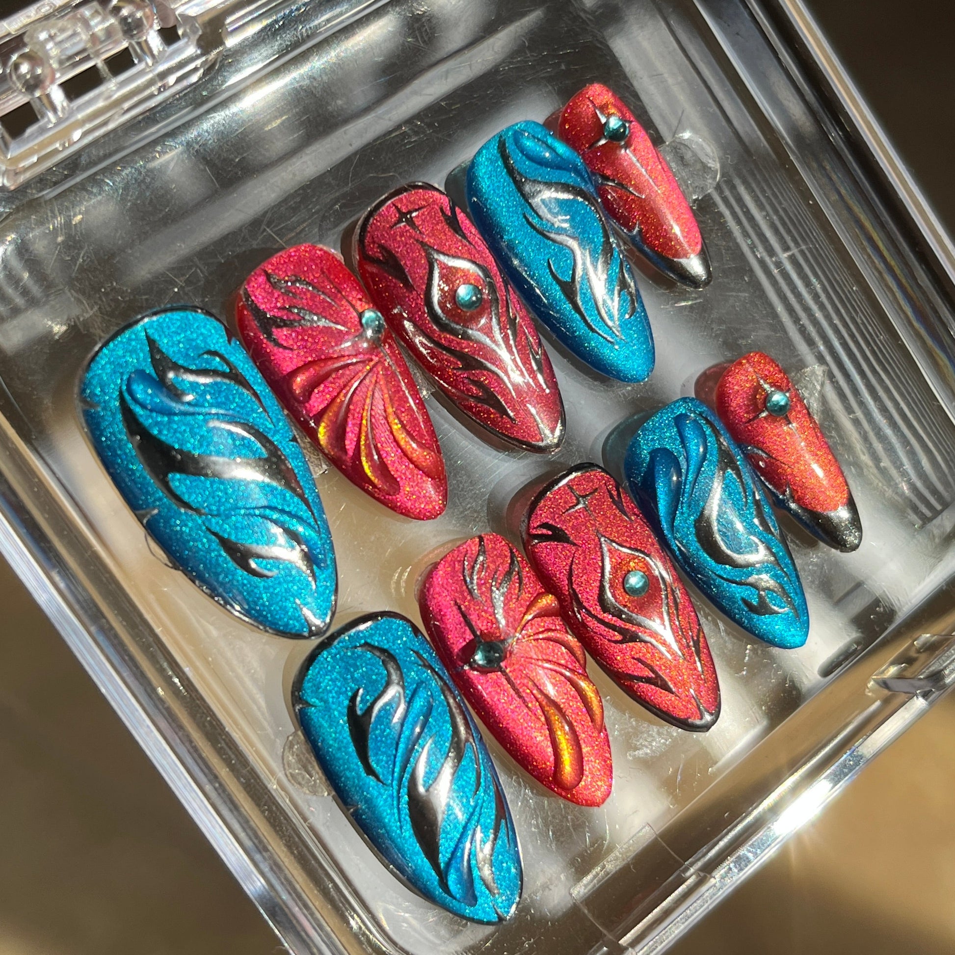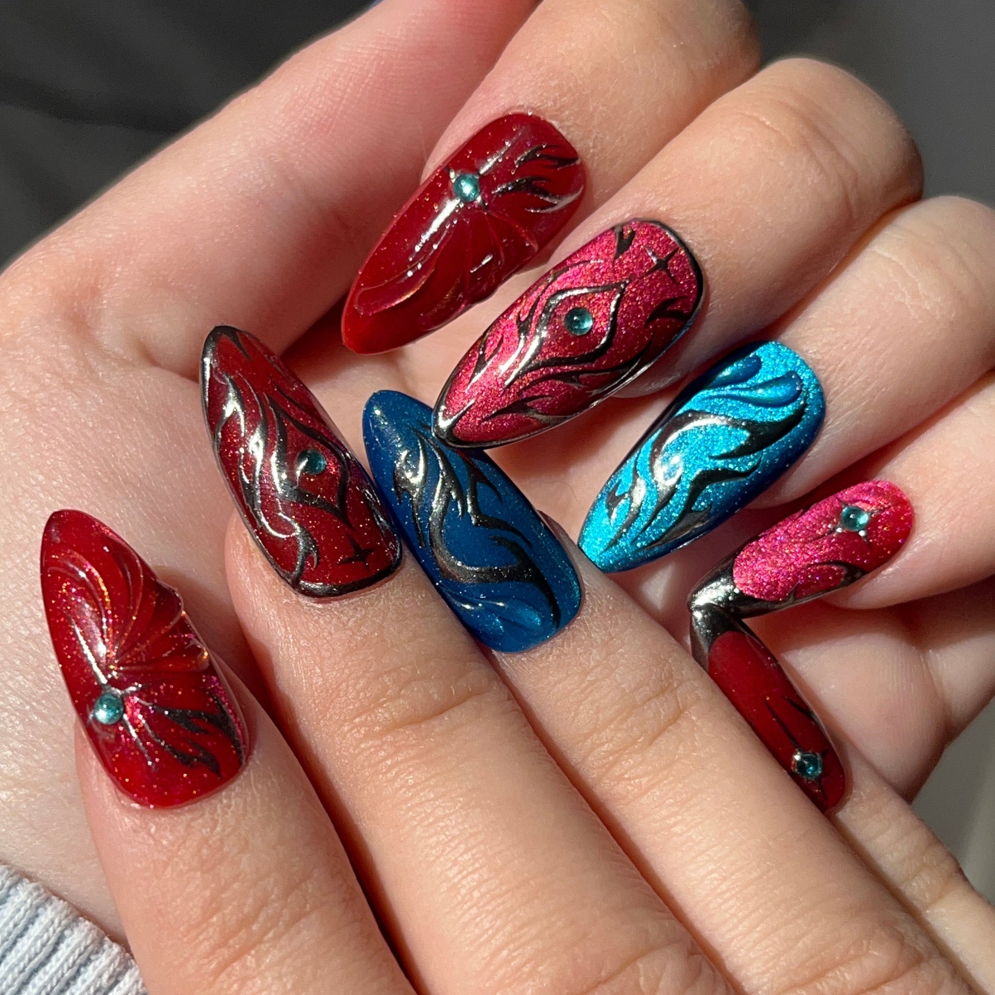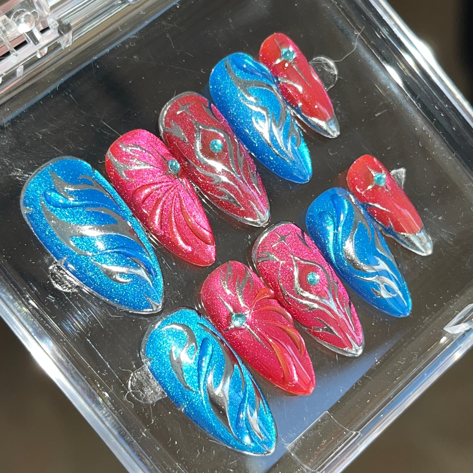 Description: Shimmering pink-and-blue press-on nails with a radiant cat-eye glow. Silver accents and blade-like motifs echo fluid movements and flawless technique. Equip them to gain a +15% Dancing Strike Speed, letting your elegance hit as sharply as your style